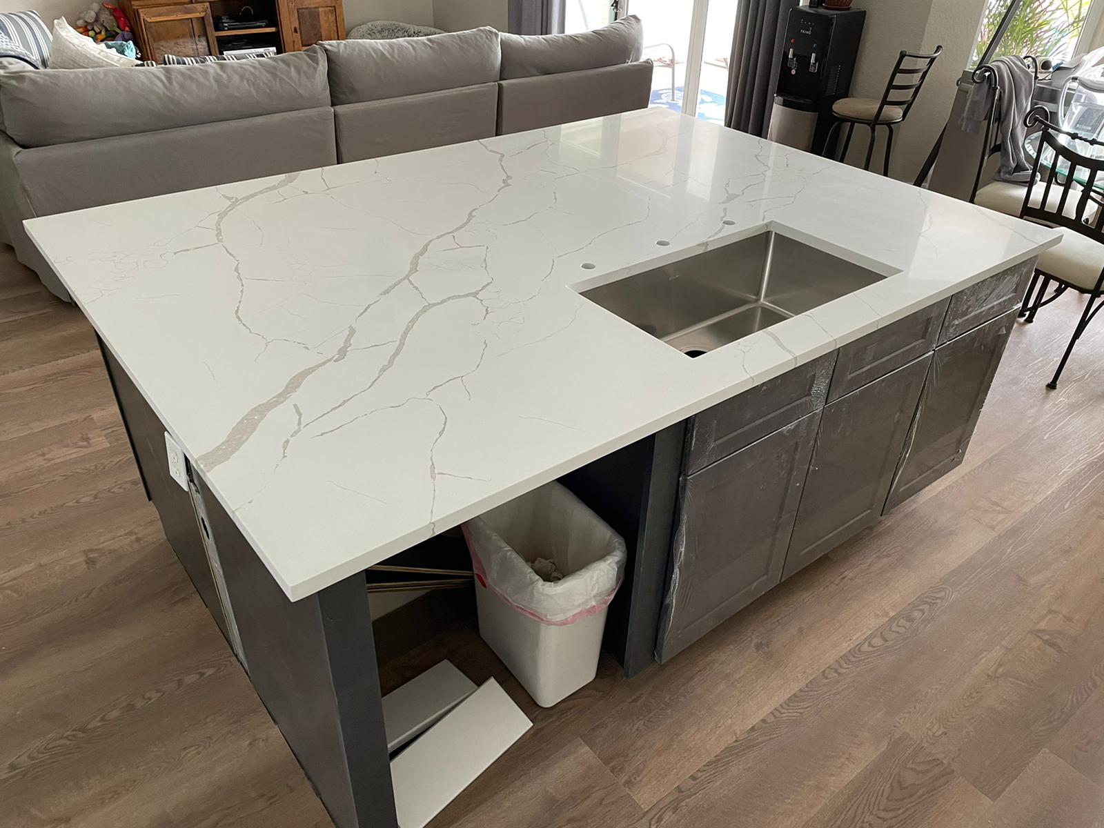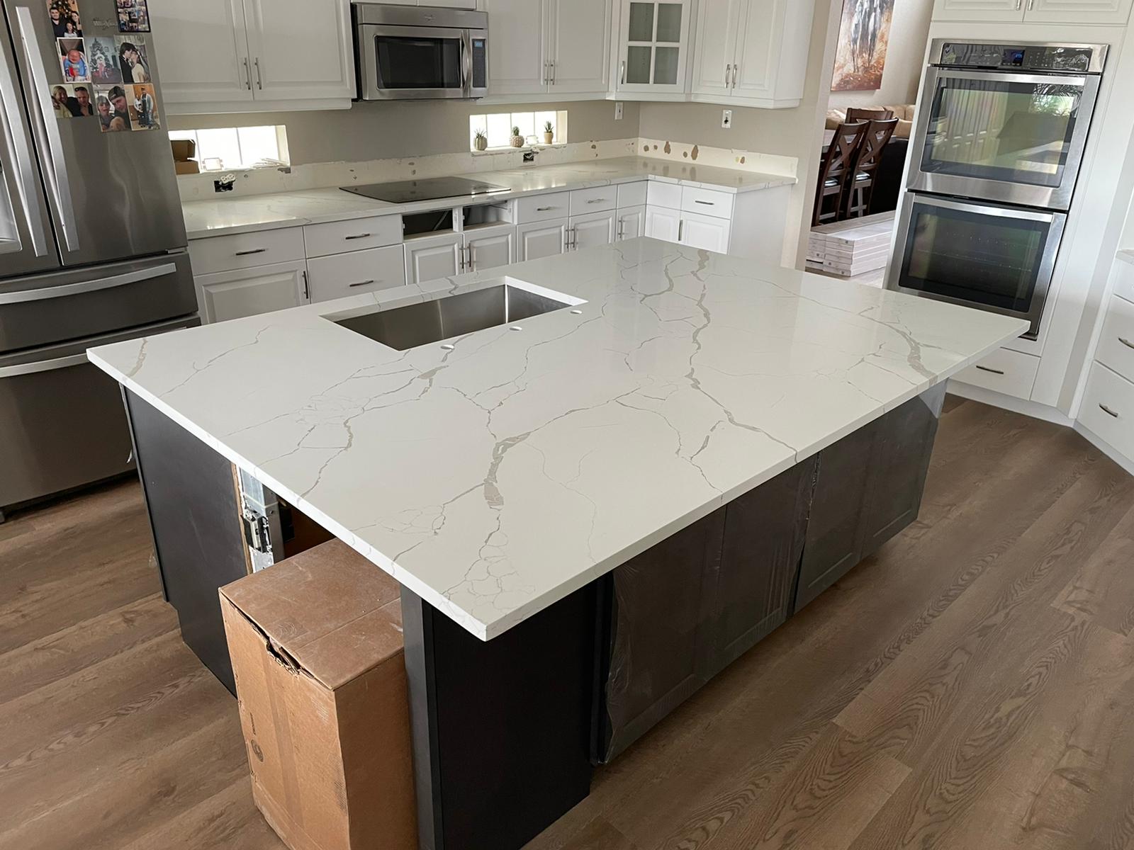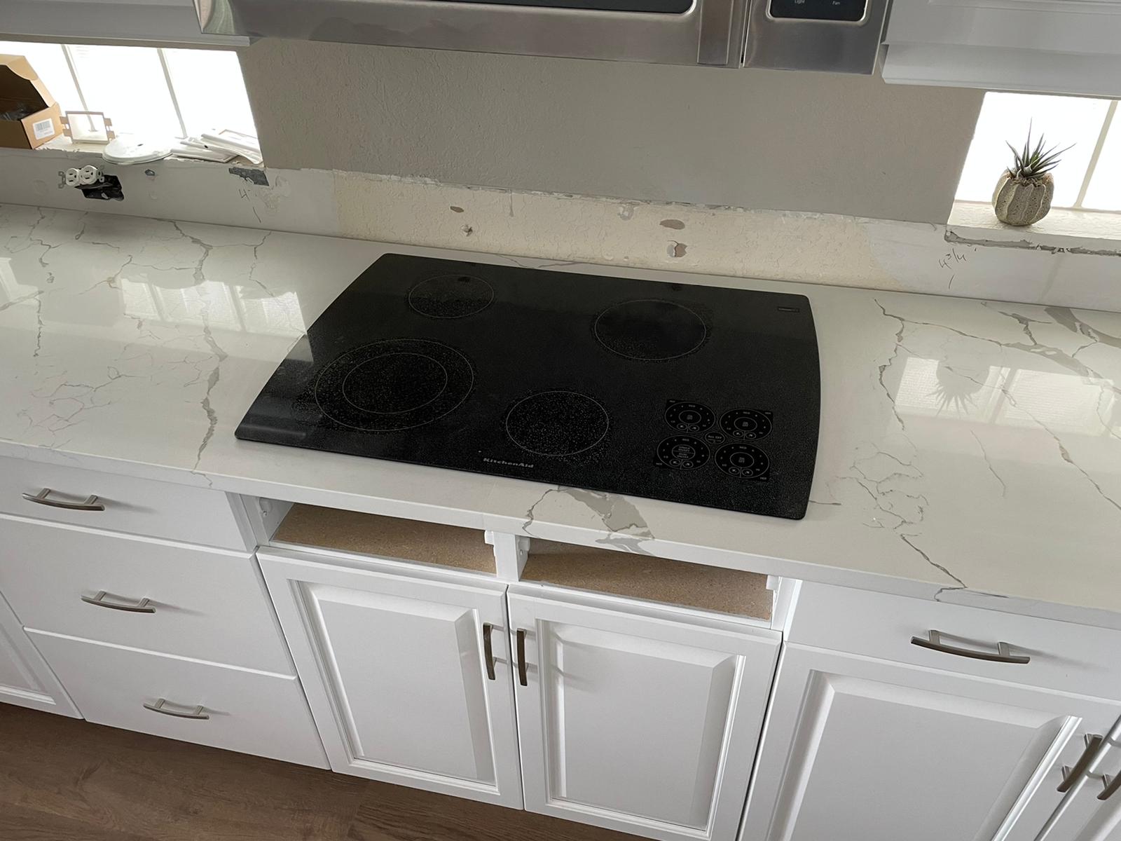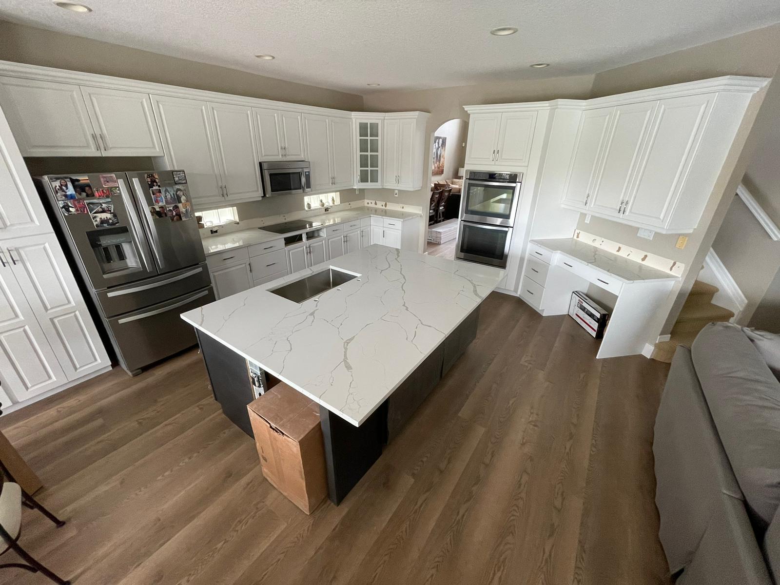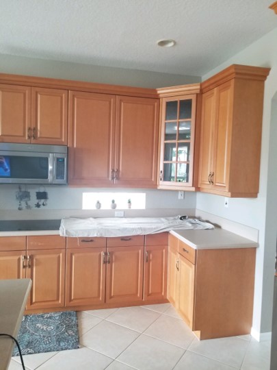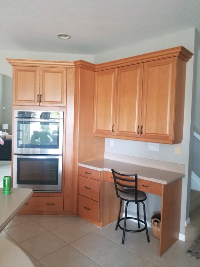 In the kitchen refinish, we kept all the existing wall cabinetry. The wall cabinetry was sprayed and refinished. The old built in framed and drywalled and pantry was converted into a cabinetry pantry. We built a new island all the countertops were updated.